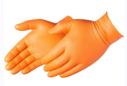 Extra-strong nitrile orange industrial grade glove with no rubber latex. These gloves have a Diamond Finish surface for extreme grip in greasy and wet environments.
