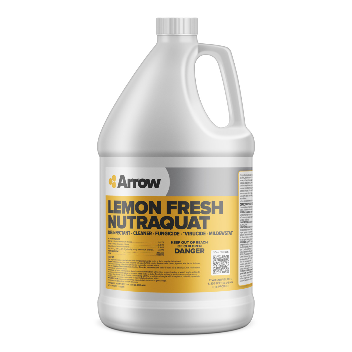 Lemon Fresh NutraQuat from Arrow is a neutral pH disinfectant, virucide, fungicide, mildewstatic, deodorizing cleaner. An effective, one easy step solution that can tackle a wide variety of microorganisms including: staphylococcus aureus, streptococcus pyogenes, HIV-1 and the Coronavirus that causes COVID-19. Lemon Fresh NeutraQuat instantly deodorizes and leaves a clean, natural fragrance while eliminating disease and odor causing germs.