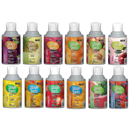 All Fruit Scents are cases of 12 selected Champion Sprayon® SprayScents® (Mulberry, Piña Colada (Passion Fruit), Cherry Jubilee, Orange Sun, Georgia Peach, Apple Blossom, Lemon Drop, Mango, Strawberry, Mandarin Mist, Juicy Green Apple and Wild Berry). They contain Ordenone™, a deodorizing ingredient that is an effective odor eliminator. The measured spray completely eliminates unpleasant odors and leaves a clean, fresh scent in the air, deodorizing up to 6,000 cubic feet. Our metered air fresheners are manufactured with a universal actuator tip and will fit most metered-aerosol dispensers.