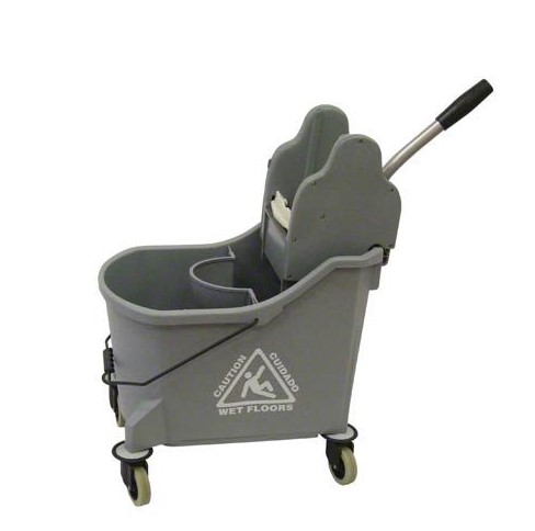One roller wringer. One-piece blue divided bucket. 4.5 gallon dirty solution capacity. 3.0 gallon clean solution capacity.