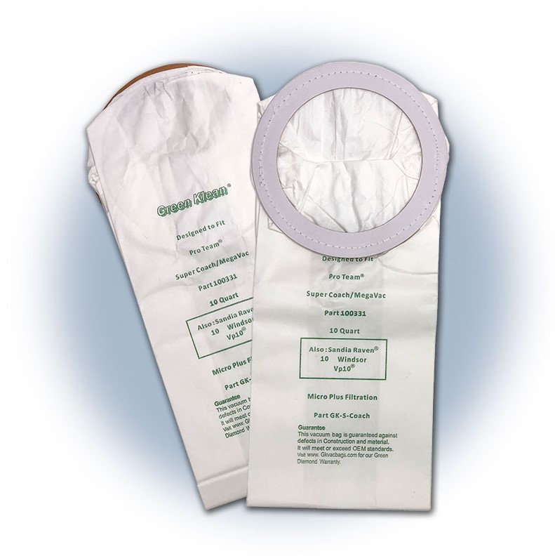 10 bags per pack / 10 packs per case (100 bags)Fits: ProTeam GoFree[R] Flex Pro cordless backpack 10 qt. Green Klean[R] Replacement vacuum bags use the highest quality Micro-Plus filter media including Melt-Blown inner liner in order to achieve filtration efficiencies up to 99.9%. Designed specifically for commercial use, they are always equal to, or exceed OEM quality. Better filtration means cleaner air, less dusting, longer secondary filter life, at considerable savings. Each bag is printed to easily identify the vacuum it fits. Backed by Green Diamond warranty. Maintains suction longer than conventional bags: better suction, less vacuuming. Keeps machines running at peak performance. Removes many indoor allergens, especially in the critical 0.3 to 1 micron range.