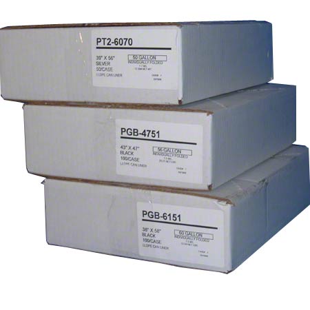 Available in sizes ranging from 7 gallon to 60 gallon. Available in gauges ranging from 1.0 mil to 2.0 mil. PGB bags contain a blend of environmentally friendly recycled resins. Individually folded and packaged in rugged, white corrugated cartons. Black. Gallon Capacity: 12-16. Maximum Dry Load Capacity: 40 lbs.